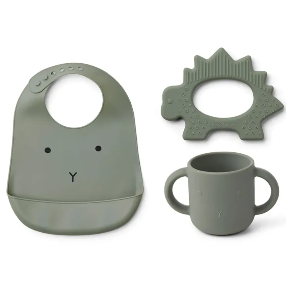 Venez découvrir notre Set bavoir+gobelet+anneau de dentition carol vert faune de la marque Liewood à découvrir sur Fabrique de Styles100% silicone