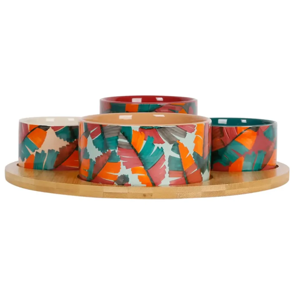 Découvrez le magnifique plateau apéro Seguia accompagné de ses 4 coupelles en grès et bambou multicolore, un choix parfait pour vos moments de convivialité.