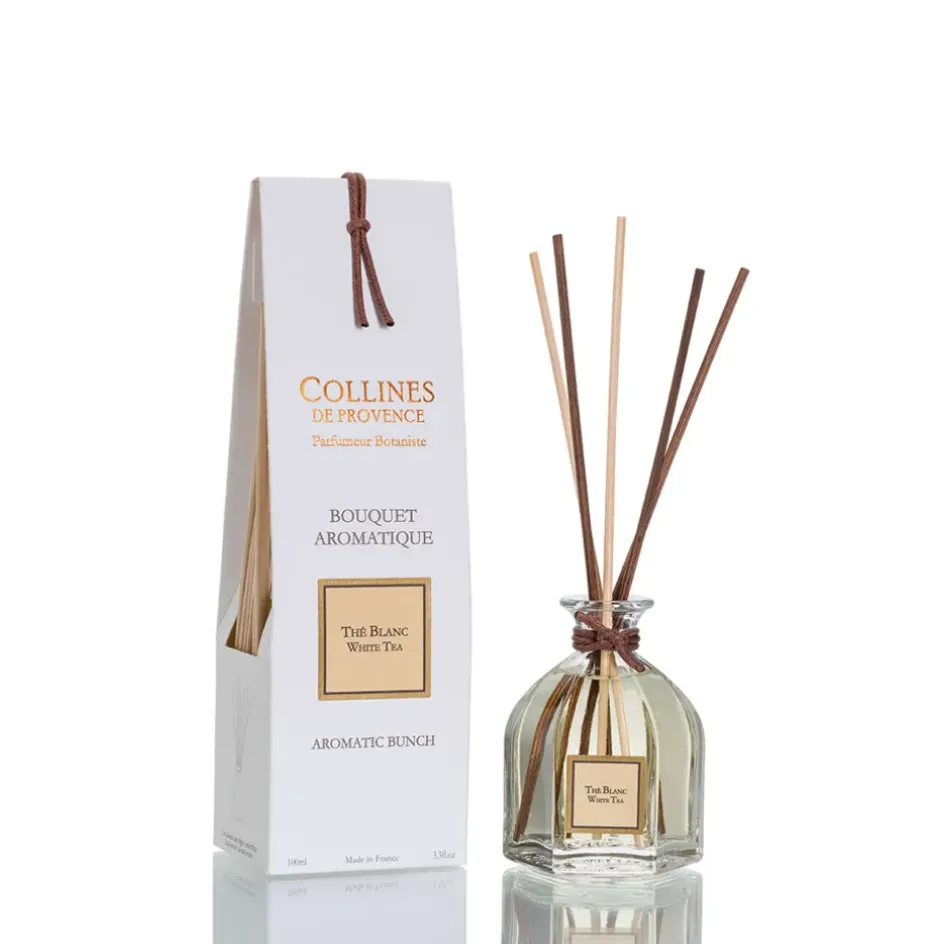 Laissez-vous charmer par l’élégance du Bouquet Aromatique Collines de Provence au flacon exclusif. Ses tiges de rotin naturelles diffusent en continu des notes parfumées dans votre intérieur.Paraffine + huile de colza + verre