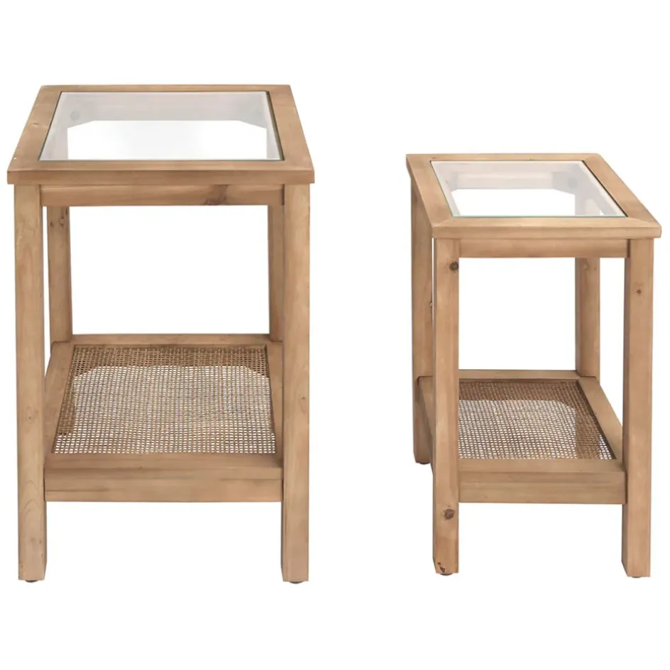 Pratiques et esthétiques, ces tables d’appoint Firmin ajoutent une note polyvalente et élégante à votre décor intérieur.Sapin et verre et rotin.