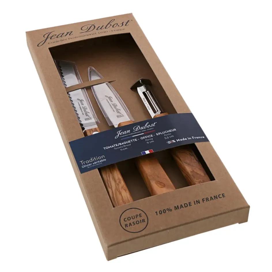 Venez découvrir notre Couteaux tradition olivier 3 pièces petite coutellerie en coffret kraft de la marque Jean Dubost à découvrir sur Fabrique de StylesACIER INOX + OLIVIER