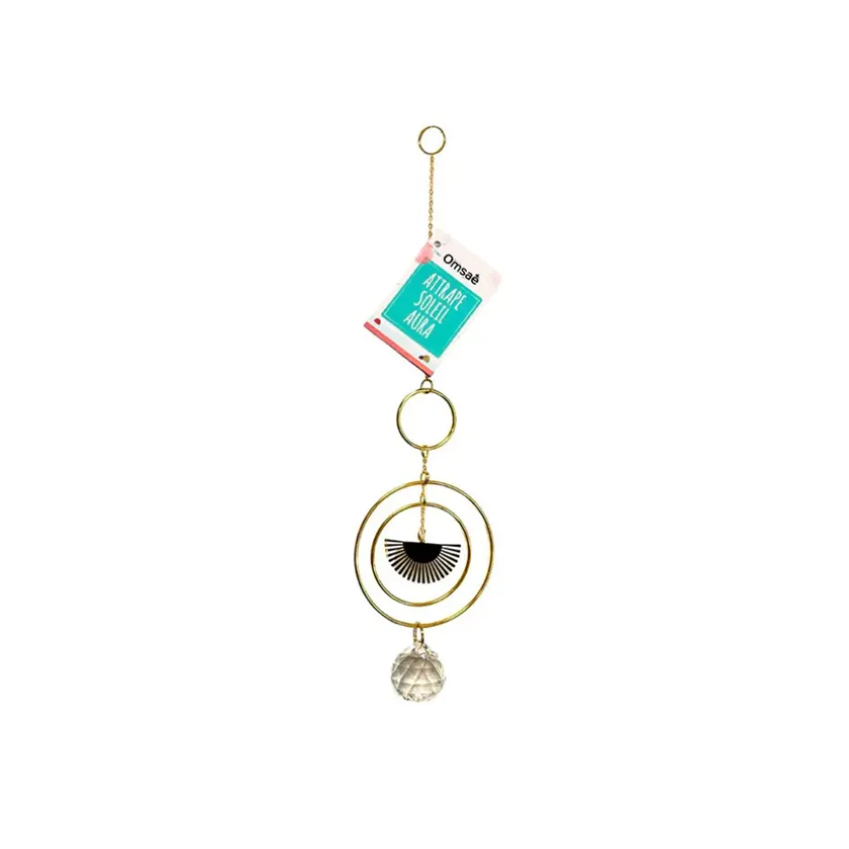 Chaque rayon de soleil capturé est l’occasion de s’accorder un moment d’évasion, rendant ainsi votre espace quotidien encore plus agréable à vivre.attrape-soleil aura en laiton doré, acier inoxydable et cristal de verre facetté. Longueur totale d’environ 27 cm.
