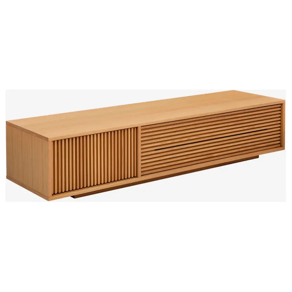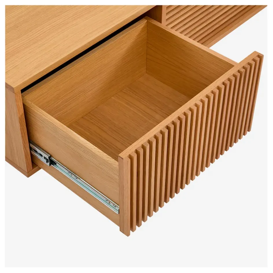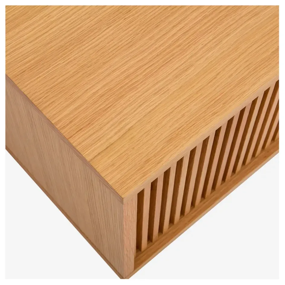 Habillée d’une multitude de lattes en chêne, ces meubles ajoutent une touche de caratère discrète à un intérieur.