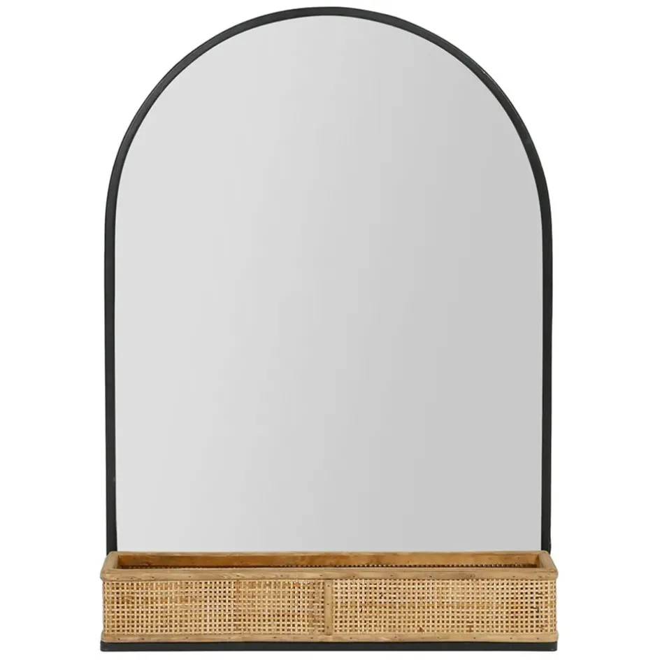 Ce miroir polyvalent offre une dimension décorative tout en offrant un espace de rangement pratique grâce à son étagère en bambou.