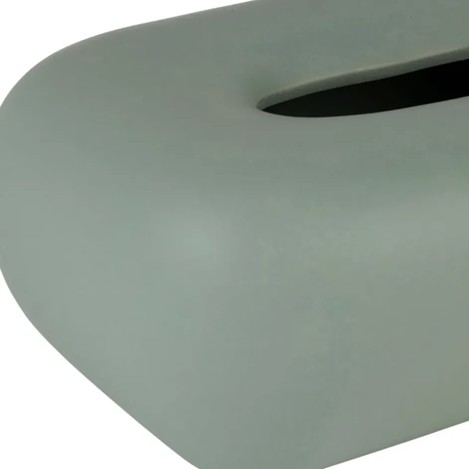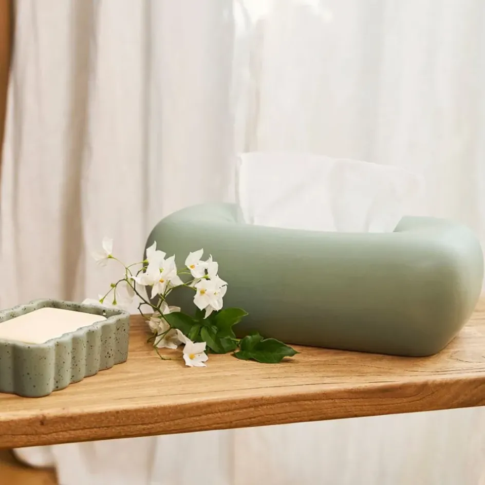Transformez votre espace avec cette boîte à mouchoirs en grès aux teintes de sauge moucheté, proposée par Klosen.