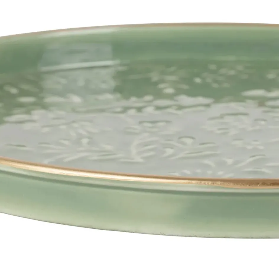 Découvrez un accessoire de choix qui ajoute du caractère à votre table : notre plateau rond en fer couleur sauge d’un diamètre de 36 cm.