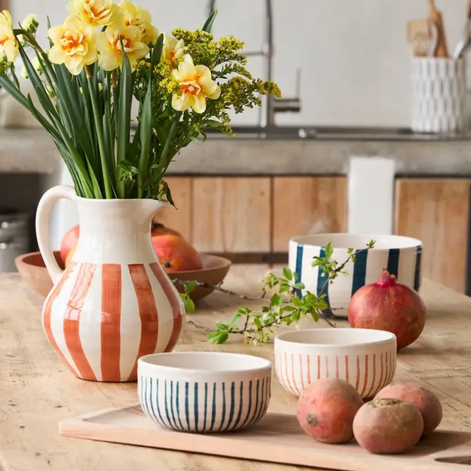 Ajoutez une touche artisanale et colorée à votre table avec le saladier en terre cuite rayé bleu Lisia.