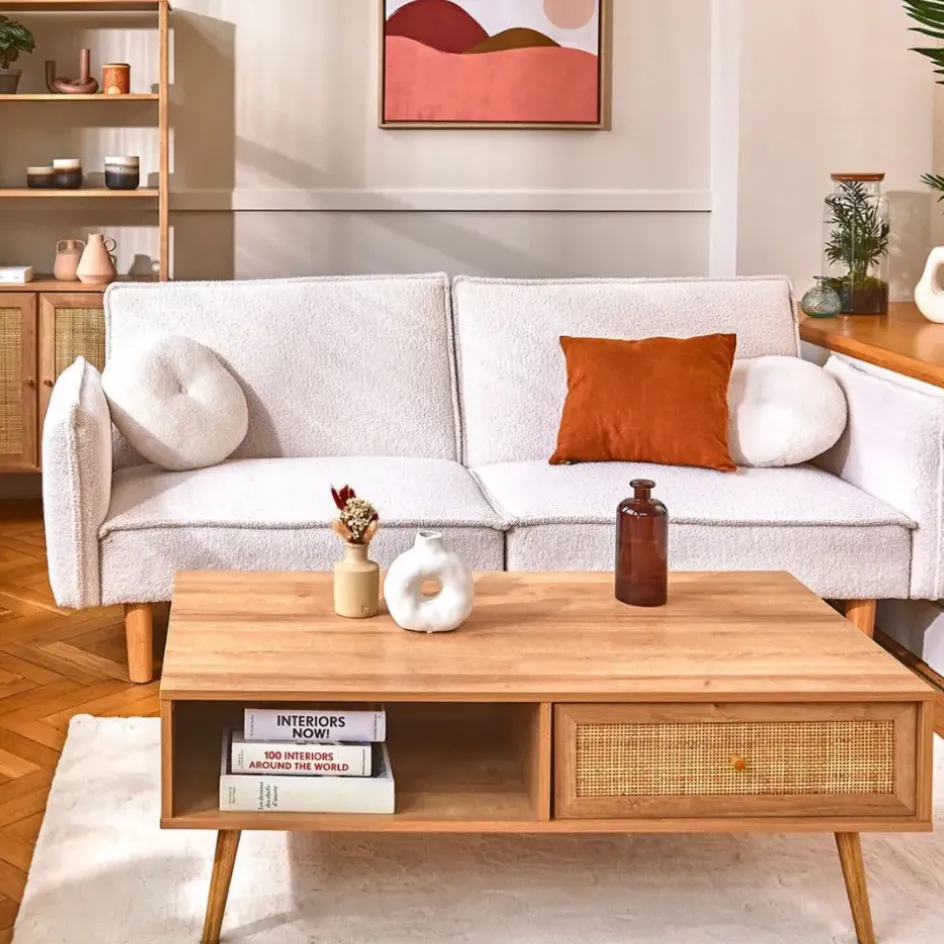 Un inconditionnel de la tendance bohème, le cannage s’associe au mdf pour une table basse accessible et fonctionnelle.