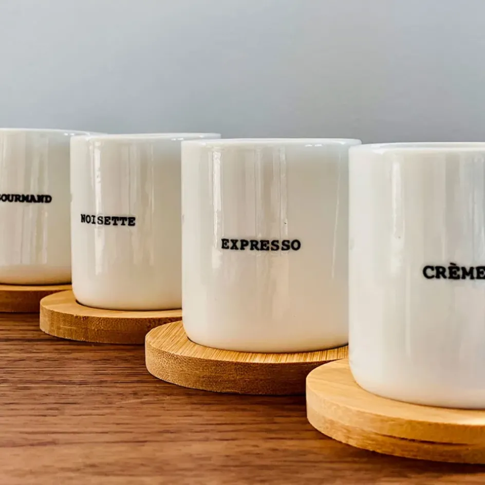 Coffret contenant 4 gobelets en faïence (100ml) et sous tasses en bambou. Les gobelets sont adaptés au lave-vaisselle et au four à micro-ondes. Les sous tasses en bambou huilé ne doivent pas être mis au lave-vaisselle ou au four à micro-ondes.Faïence