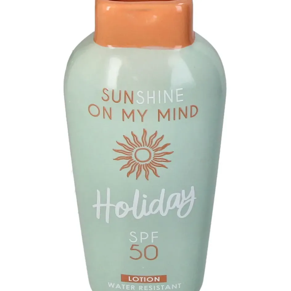 Ce vase en faïence bleu pastel imite avec humour un flacon de crème solaire, pour une déco qui sent bon les vacances !