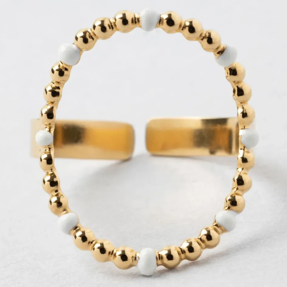 Faites-vous plaisir ou offrez ce bijou unique à un être cher et laissez briller votre style avec cette bague en acier inoxydable doré et blanc.Acier inoxydable et epoxy. Création Unique.