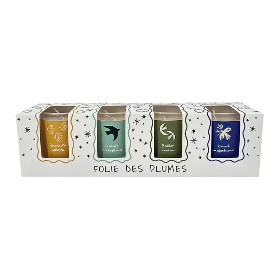 Plongez dans une atmosphère poétique avec le coffret de 4 bougies Folie des Plumes.