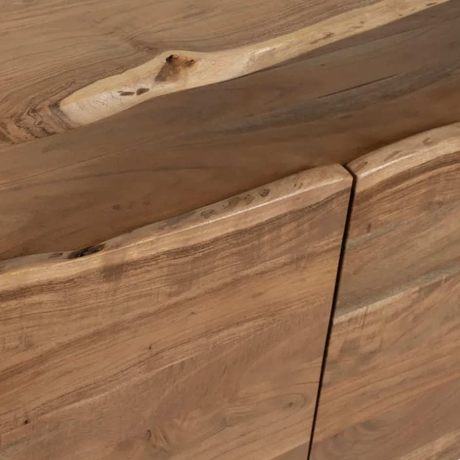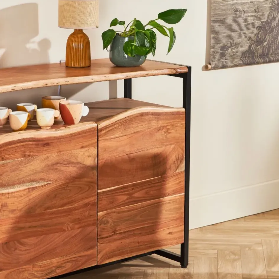 L’acacia apporte une touche de chaleur et de caractère, tandis que les pieds en fer noir ajoutent une note industrielle et contemporaine.