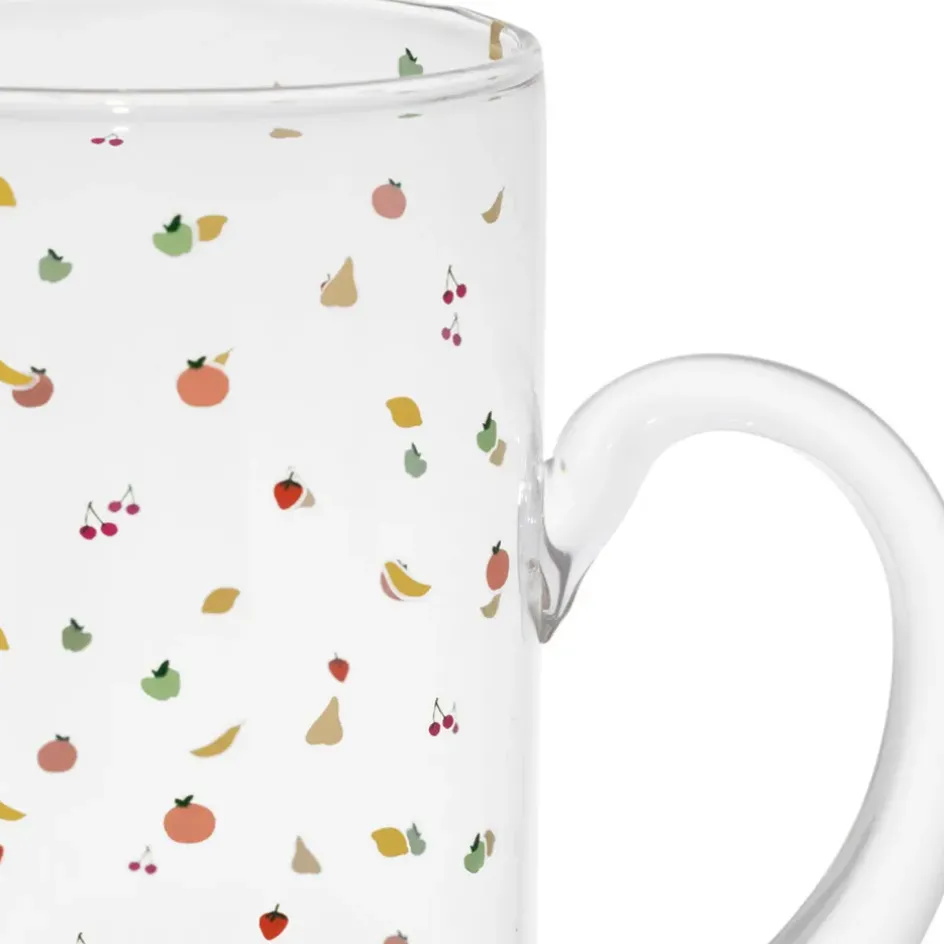 Ajoutez une touche de fantaisie et de couleur à vos boissons avec ce pichet en verre de 1 litre, orné de motifs de fruits multicolores.