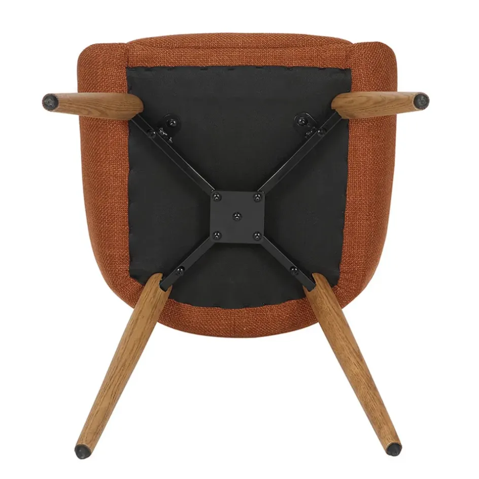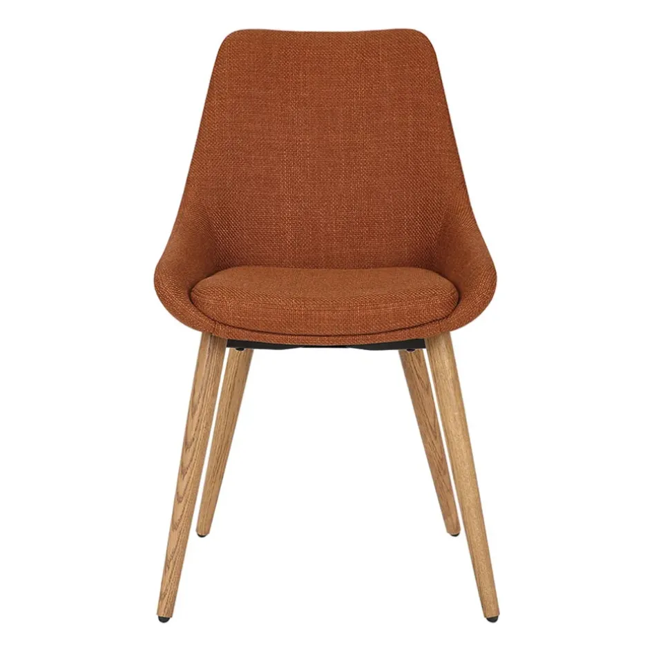 Avec son revêtement en tissu cognac et ses pieds en chêne foncé, cette chaise apporte une touche de chaleur et de caractère à votre espace repas.
