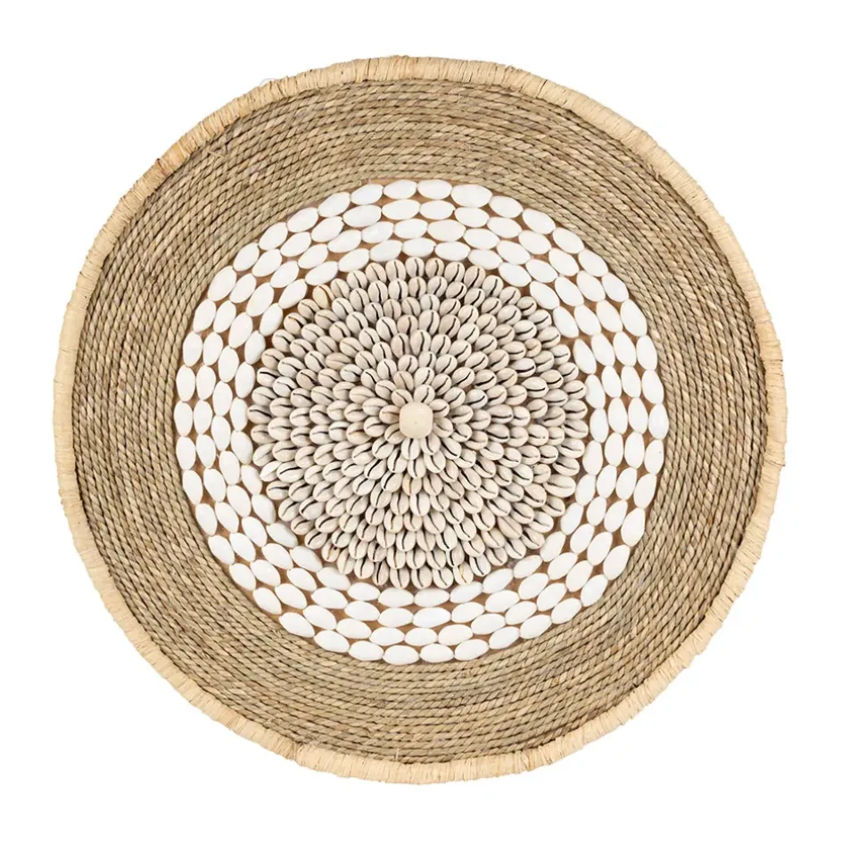Le Cauri, symbole de prospérité et de protection dans de nombreuses cultures, ajoute une signification spirituelle à votre espace de vie.Coquillage + contreplaqué + jonc de mer