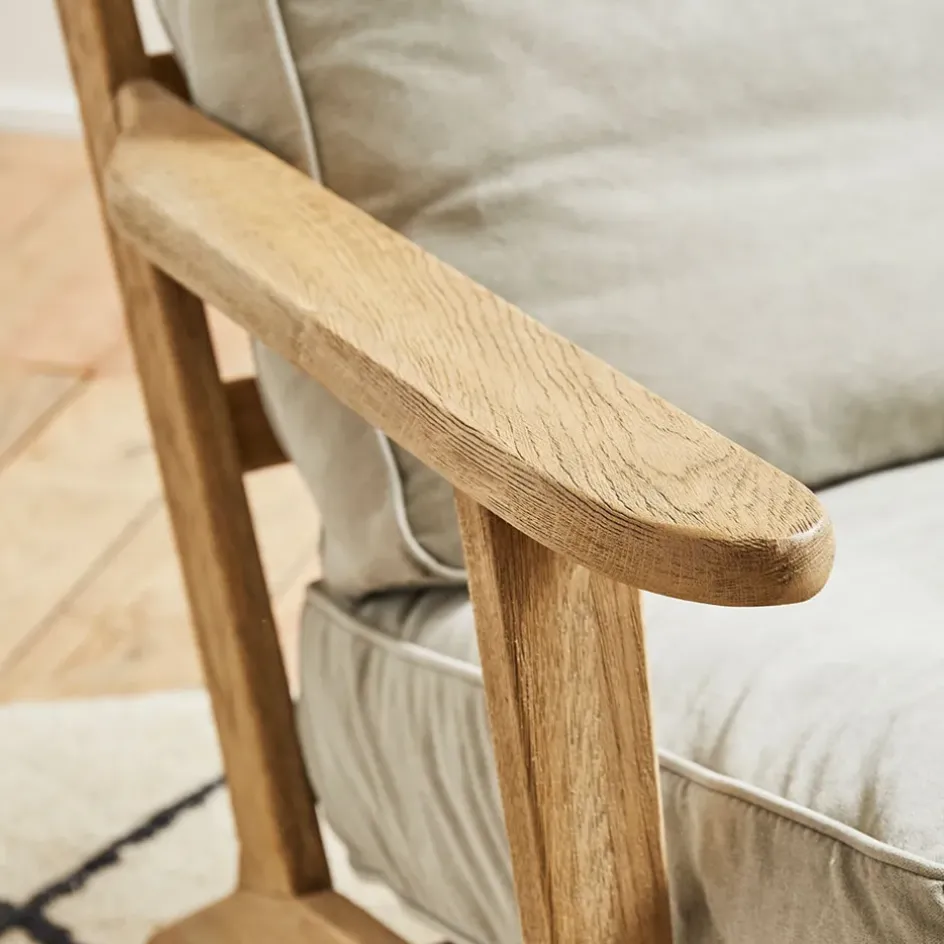 Succombez au fauteuil Laureli, véritable fauteuil design en bois et en tissus. Vous allez craquer pour ses lignes et la noblesse des matériaux utilisés : le chêne pour les accoudoirs et les pieds et le coto gris taupé pour les coussins.