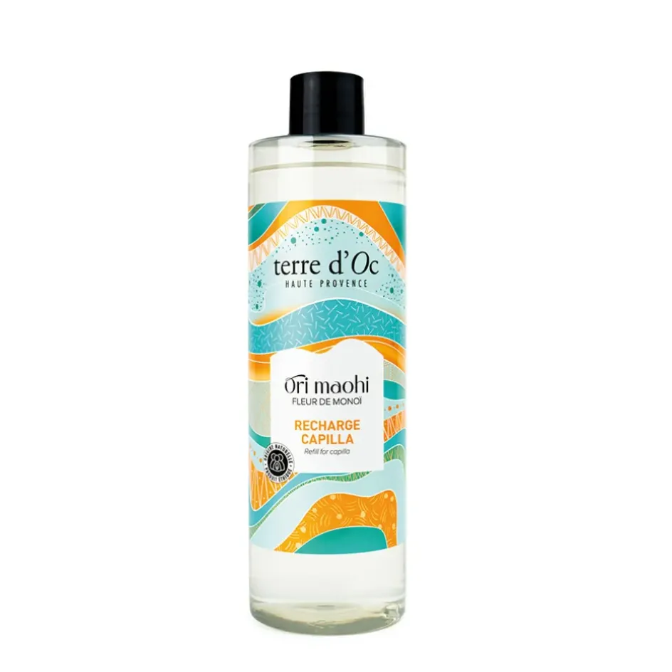 Rechargez votre diffuseur avec la recharge capillaire Fleur de Monoi – Ori Maohi de 400ml pour une expérience parfumée et revitalisante pour vos cheveux.RPET.
