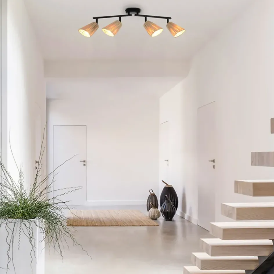 Spot 4 lumières base en métal peint. Abat-jour forme conique en raphia tressé à la main. Têtes orientables et bras articulés. Coloris : naturel. IP20. L60cm – P18cm – H22cm. Classe 2. E14-15W.métal et raphia