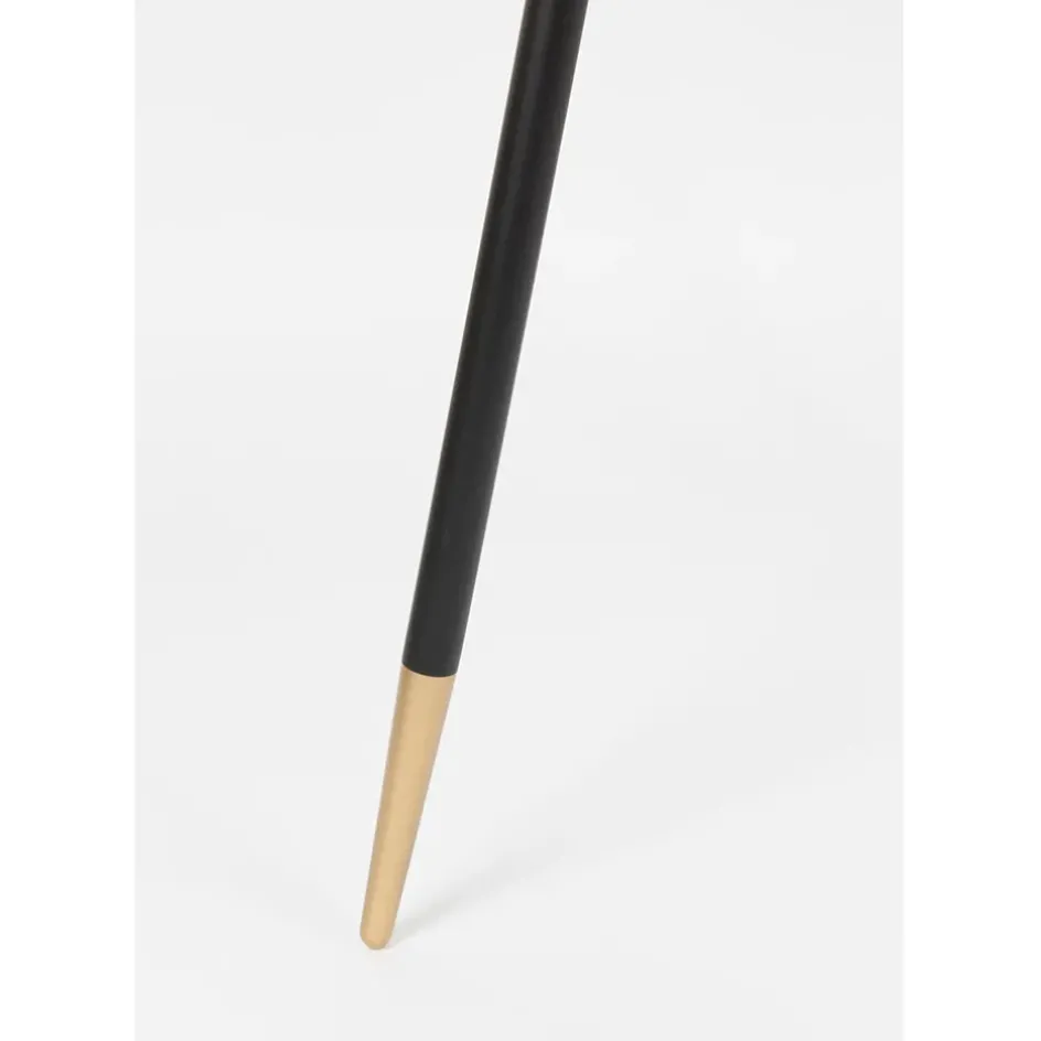 Une table qui invite à la conversation et au bonheur partagé, tout simplement.Plateau de table en MDF avec placage en bois de frêne finition couleur noyer (teinté et laqué) et bord en fer peint or. Pieds enduits de poudre noire avec pieds peints en or sur capuchons en plastique