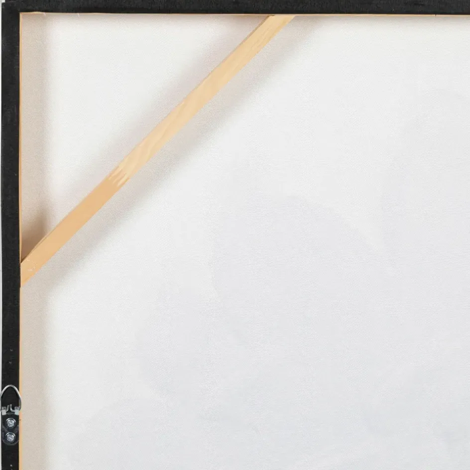 Ce tableau, réalisé sur toile de grande taille, est tendu sur un cadre en pin noir et doré, soulignant son style unique et sa présence imposante.