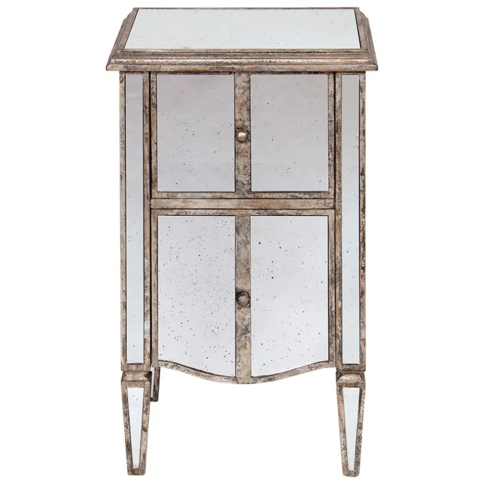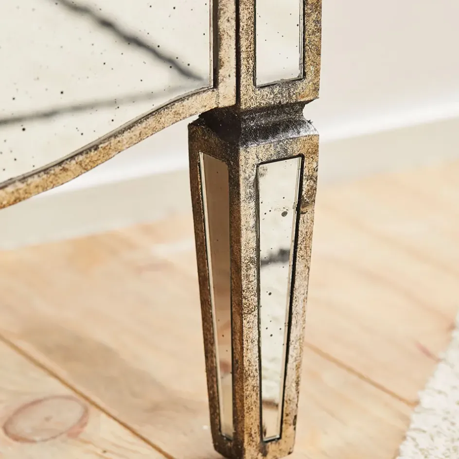 Ce chevet marie le bois patiné et le verre pour offrir un meuble au style résolument vénitien. Ce mélange de matières appelé le bois miroir trouvera parfaitement sa place dans une maison ou un appartement à la déco classique chic. Si sa forme reste