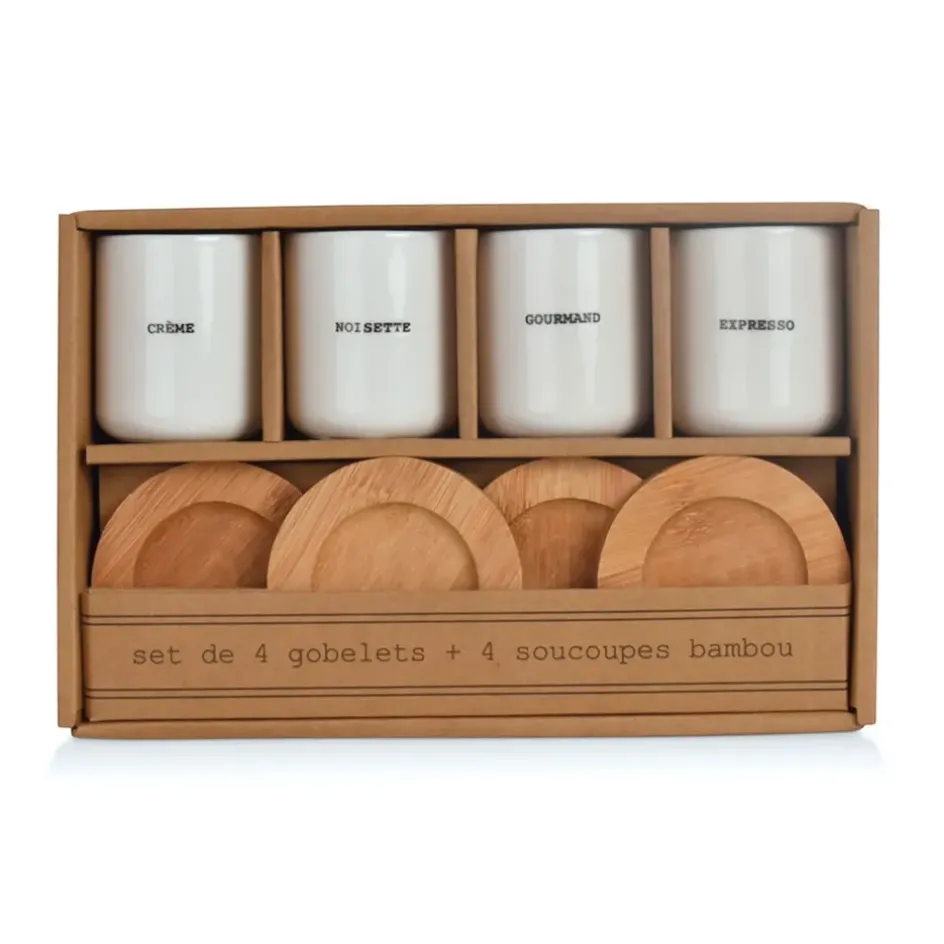 Coffret contenant 4 gobelets en faïence (100ml) et sous tasses en bambou. Les gobelets sont adaptés au lave-vaisselle et au four à micro-ondes. Les sous tasses en bambou huilé ne doivent pas être mis au lave-vaisselle ou au four à micro-ondes.Faïence