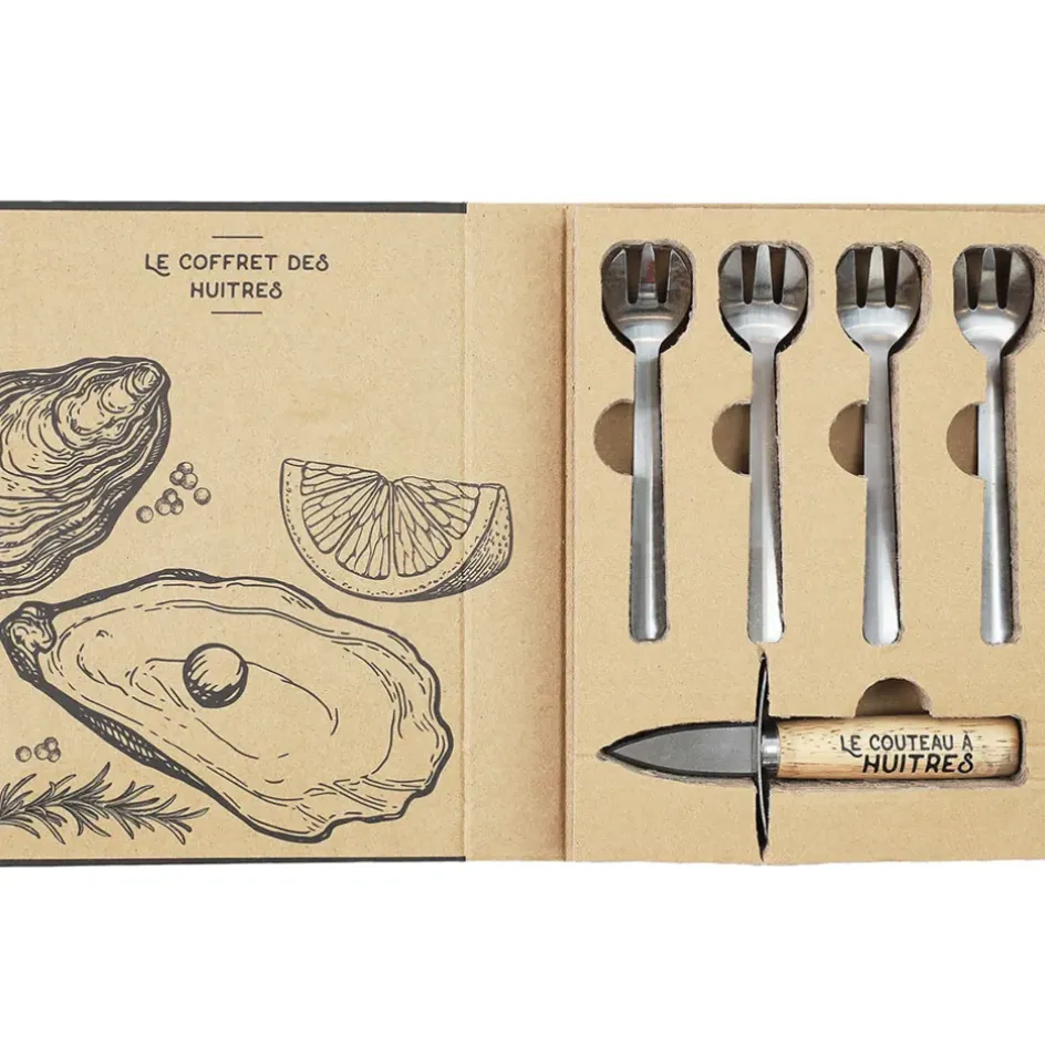 Ce coffret comprend un couteau et quatre fourchettes, spécialement conçus pour ouvrir et savourer vos huîtres préférées en toute simplicité.