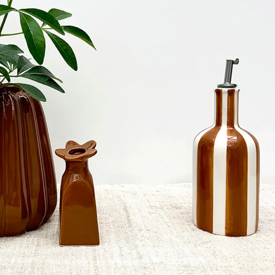 Ajoutez une touche originale à votre cuisine avec cet huilier en faïence rayé marron.